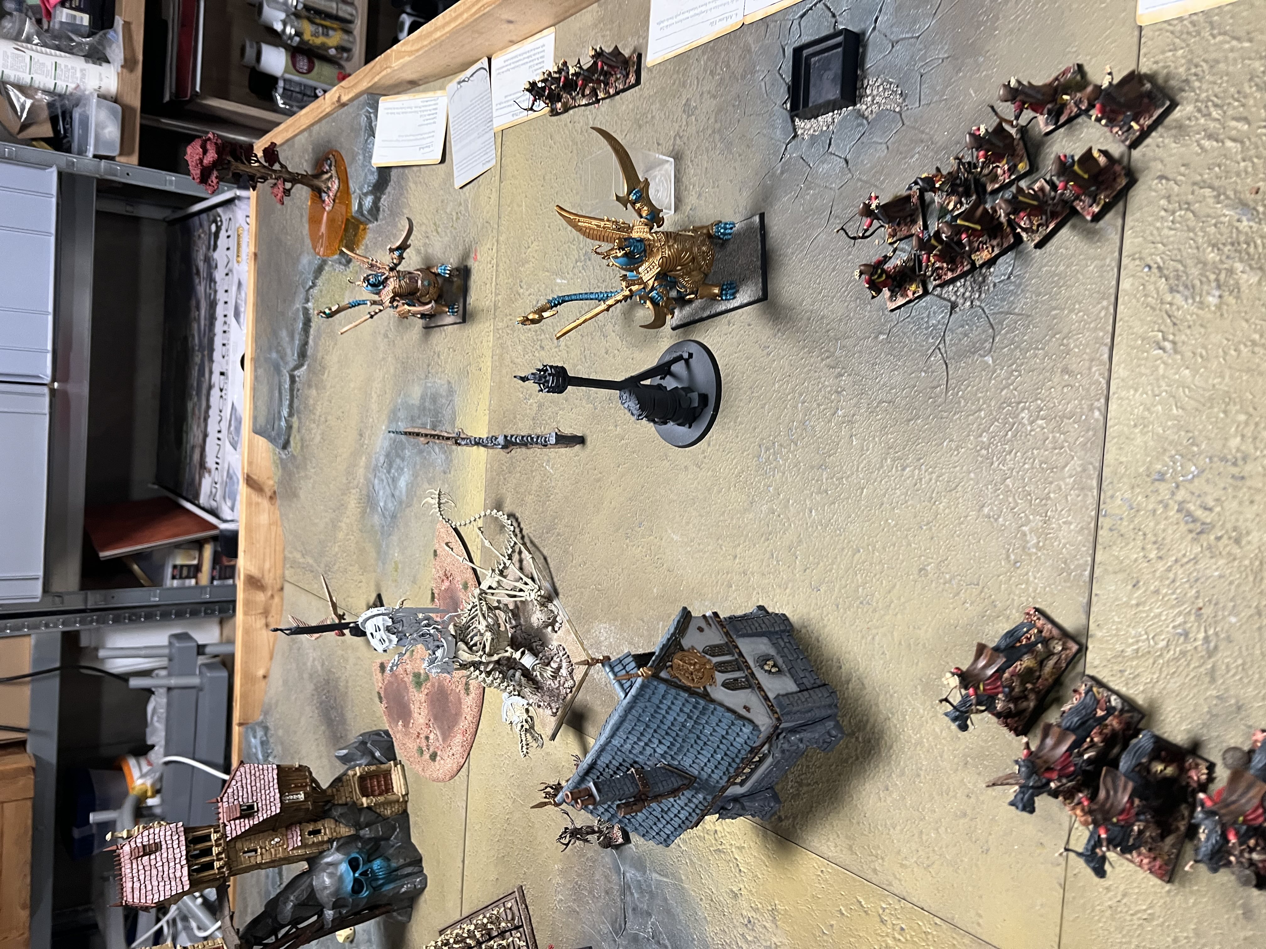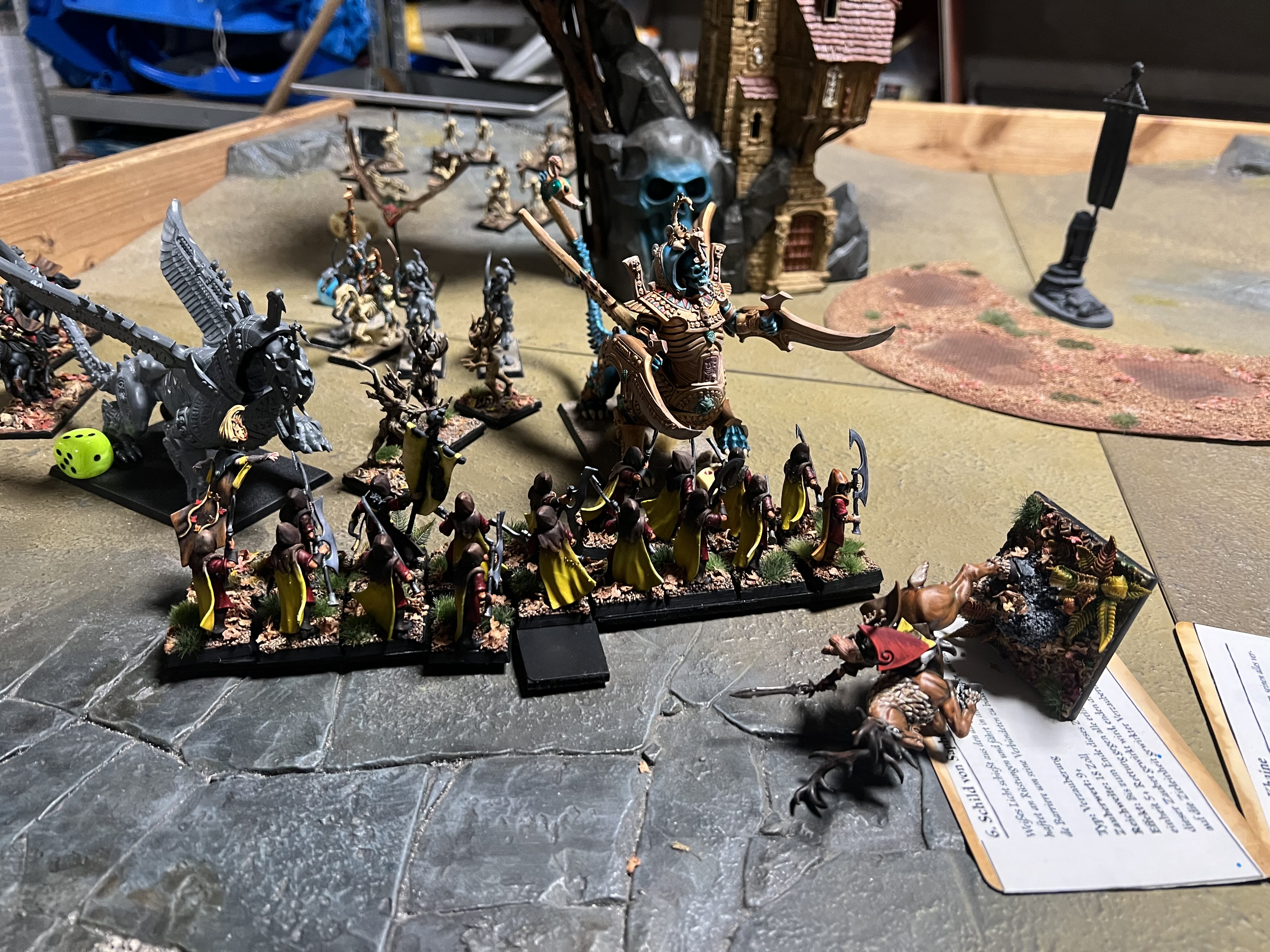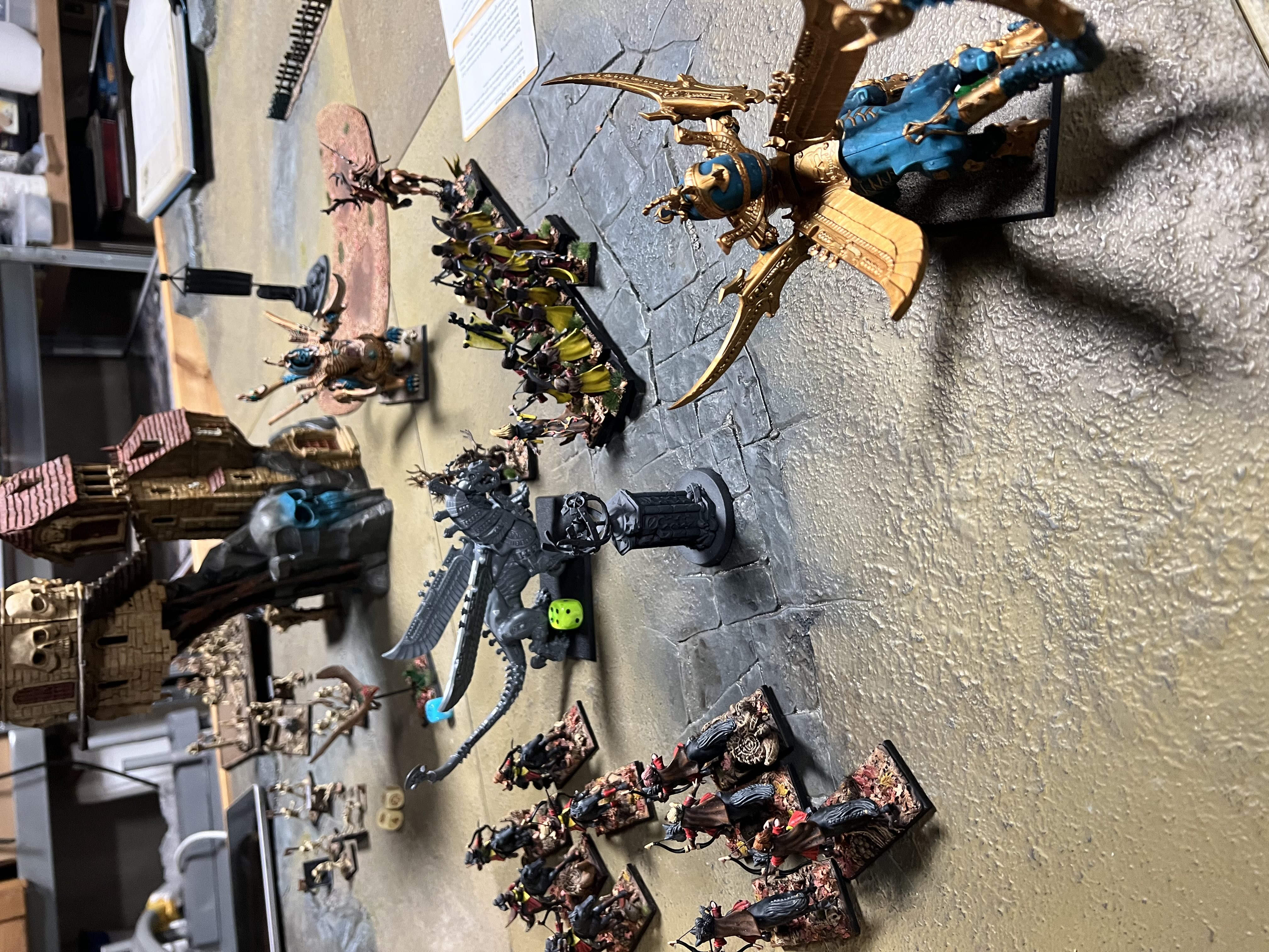 Ihnen gegenüber stand die starre Front Khemris. Reihen aus Knochen, uralten Schilden und verfluchten Standarten streckten sich über die Felsmulden. Die Gruftwächter bildeten das Herz der Armee, unerschütterlich, während Skelettkrieger und Ushabti zu beiden Seiten warteten. Über ihnen spannte der Gruftkönig seinen Blick in die Ferne, erhoben auf dem Rücken eines Knochendrachen, dessen Zähne wie gealterter Elfenbeinbruch glänzten. Doch Kanoteph, der Hohepriester, fehlte. Die Assassinen der Echsen hatten ihn aus dem Krieg gerissen, und sein Fehlen war wie ein kalter Riss durch die Ordnung der Untoten.