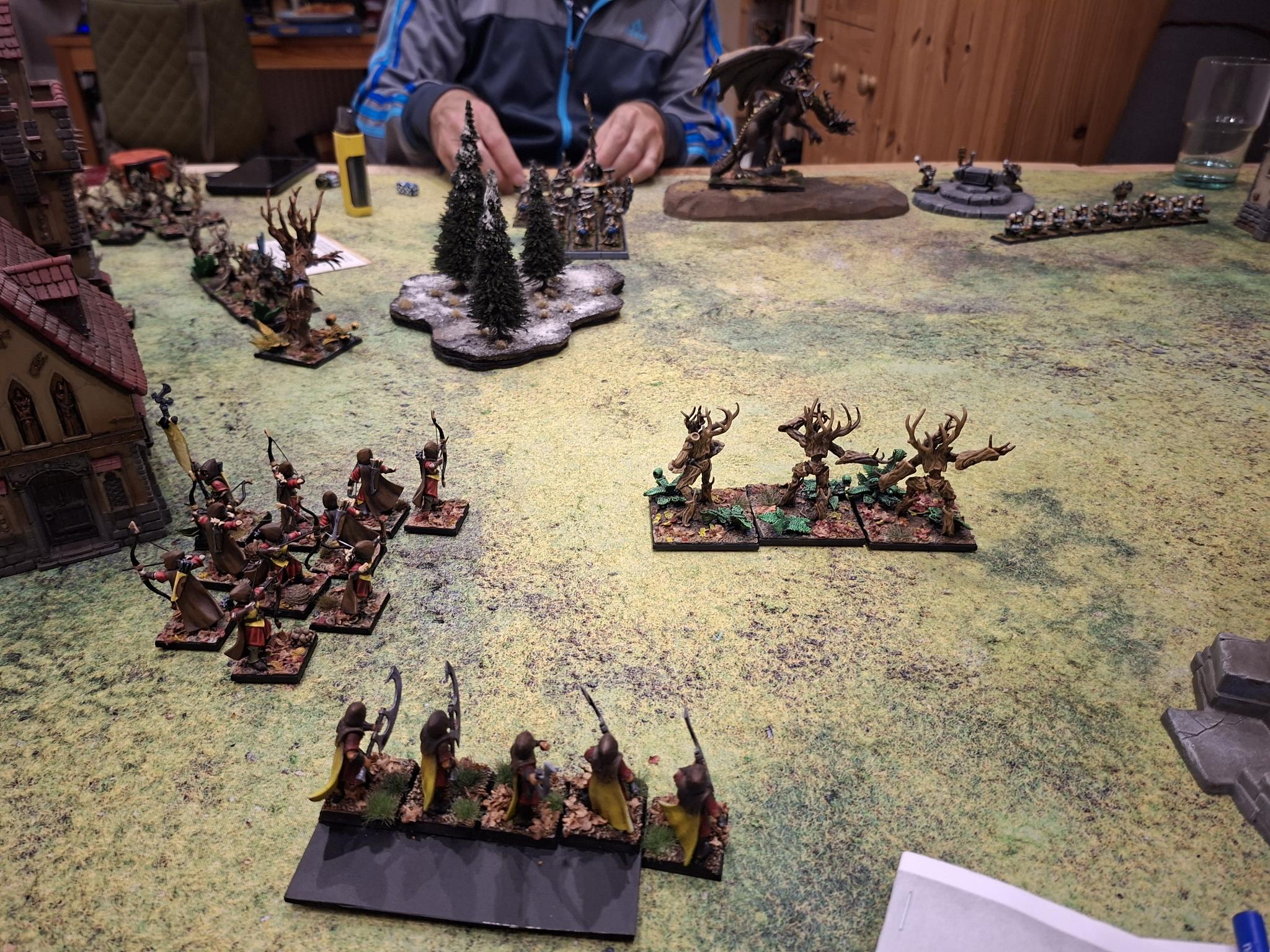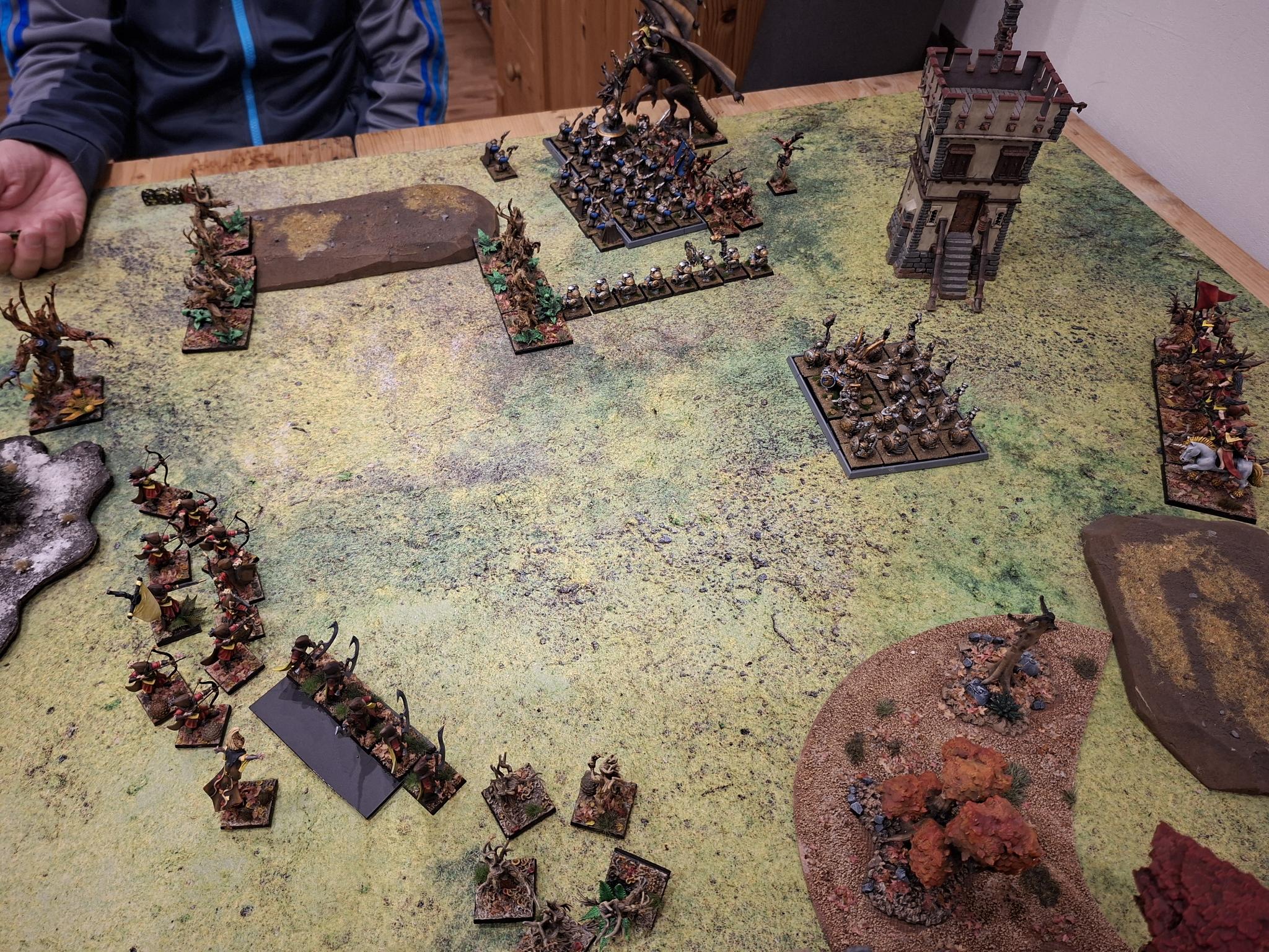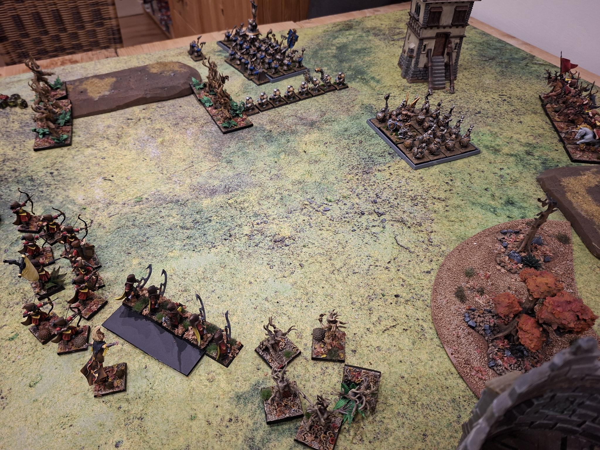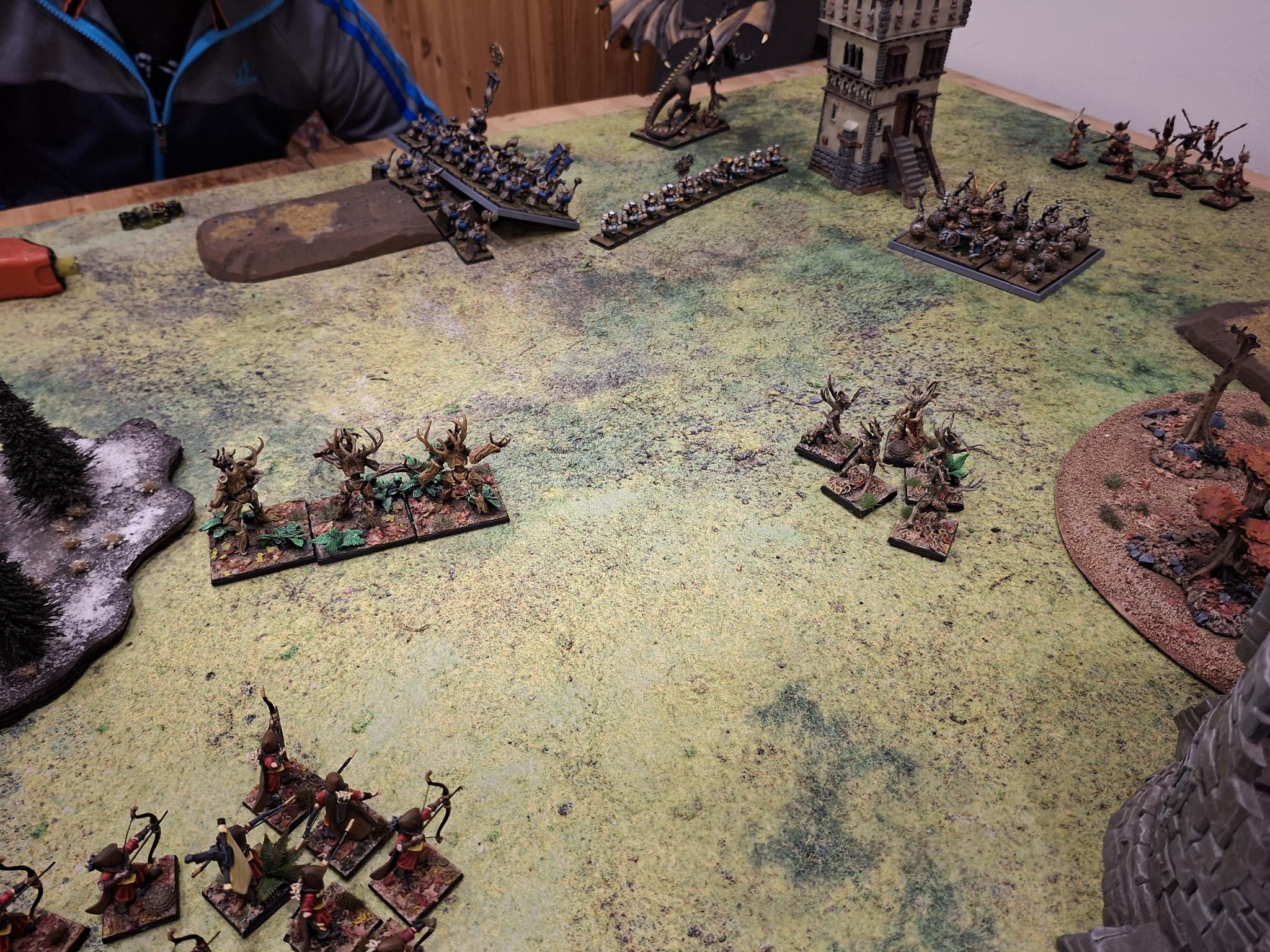 Doch die Natur selbst erwies sich nicht als unaufhaltsam. Zwei Einheiten Dryaden stürmten gegen die Armbrustschützen – und fanden ihr Ende im kalten Stahl der Zwergenbeile. Triumphierend standen die Schützen über einem Hügel aus gesplittertem Holz, nur um im nächsten Atemzug vom uralten Baummenschen gewürgt zu werden. Seine Ranken packten sie, zerdrückten Brustkörbe und brachen Knochen, bis nur noch ein Häuflein Überlebender zurückblieb.