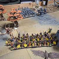 Thalendril gab das Zeichen. Ein Wispern weißer Magie glitt durch die Bannwaldhüter, Schärfe und Geschwindigkeit zugleich. Sie brachen aus wie eine Flut, die lange zurückgehalten worden war. Noch ehe die Gruftwächter ihre Schilde enger schließen konnten, schlugen elfische Gleven wie ein Sturm über sie hinweg. In wenigen Atemzügen wurde die uralte Leibgarde der Toten zunichtegemacht, Schilde zersplitterten, Schädel rollten über Fels und Wurzel. Dann rissen die Bannwaldhüter weiter, ohne Halt, und krachten wie eine lebendige Streitkeule in einen wartenden Gruftskorpion. Knochen barsten. Der Skorpion fiel.