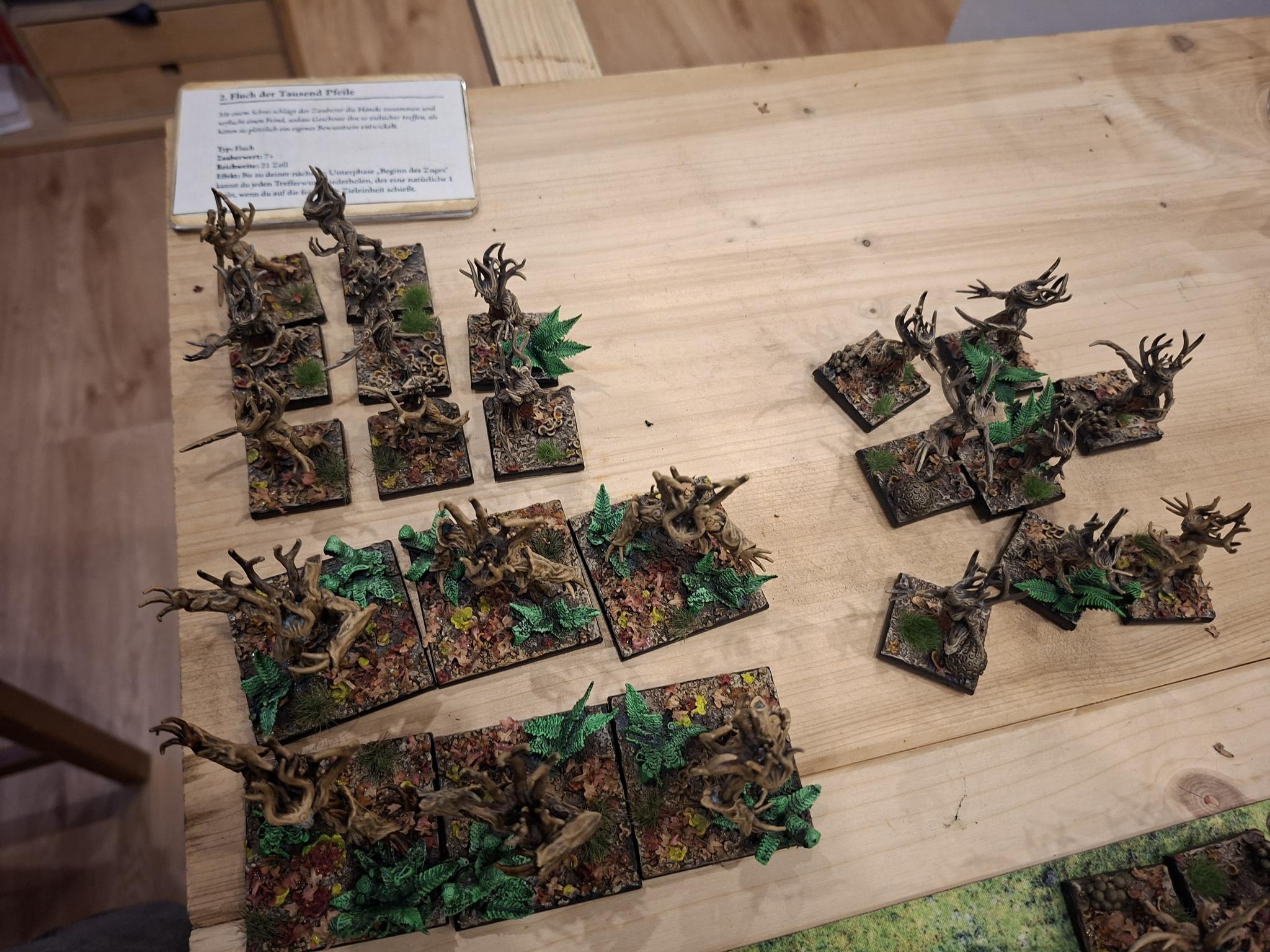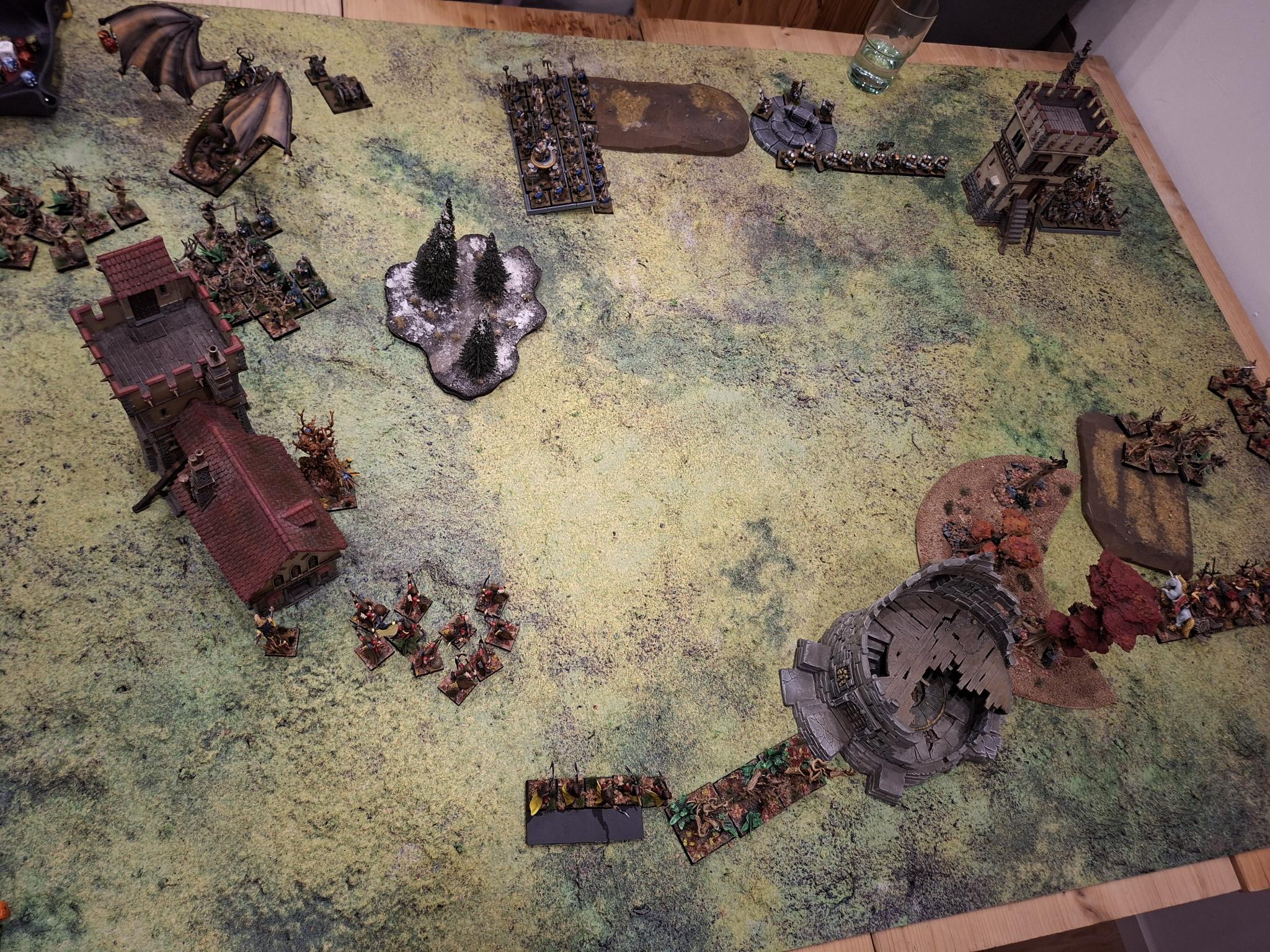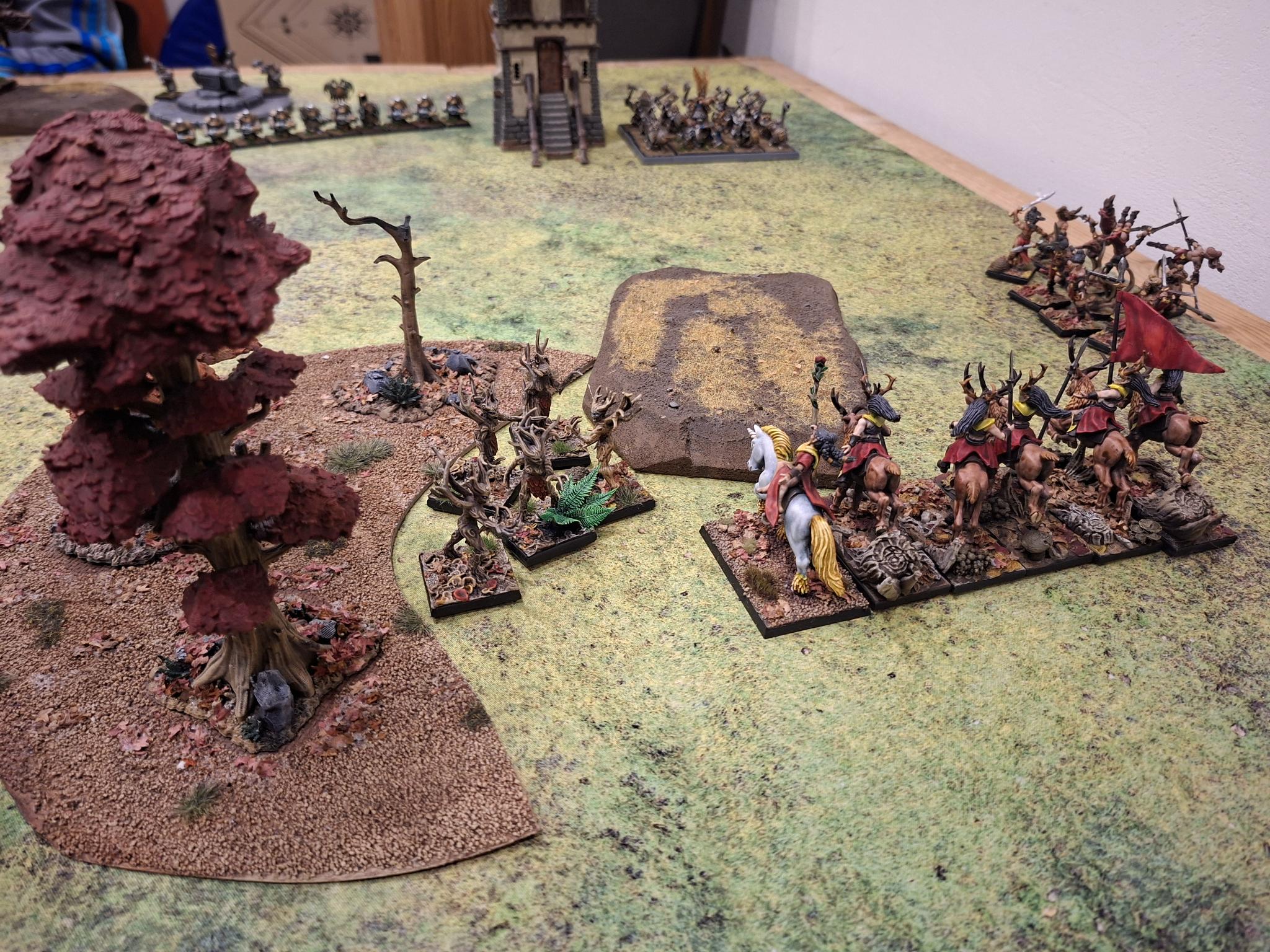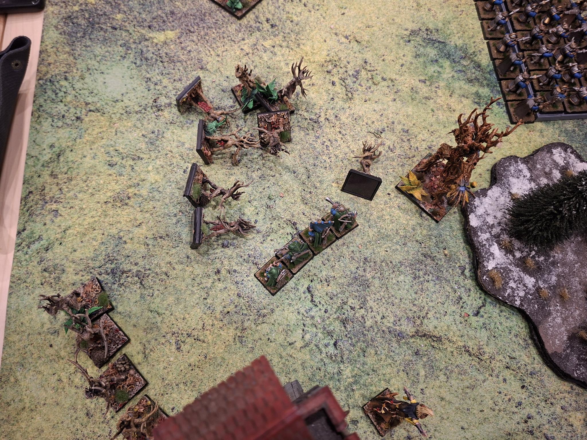 Doch die Natur selbst erwies sich nicht als unaufhaltsam. Zwei Einheiten Dryaden stürmten gegen die Armbrustschützen – und fanden ihr Ende im kalten Stahl der Zwergenbeile. Triumphierend standen die Schützen über einem Hügel aus gesplittertem Holz, nur um im nächsten Atemzug vom uralten Baummenschen gewürgt zu werden. Seine Ranken packten sie, zerdrückten Brustkörbe und brachen Knochen, bis nur noch ein Häuflein Überlebender zurückblieb.