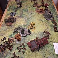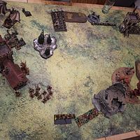 Ihnen gegenüber die Kinder der Berge: Dwinbar Feuerbart, Runenmeister von nicht geringem Ruhm, thronte auf dem Amboss der Verdammnis. Um ihn scharten sich Klankrieger, Eisenbrecher und die furchtlosen Eisenspeier. Ihre Reihen wurden durch das Grollen zweier Kanonen und die scharfen Bolzen der Armbrustschützen gedeckt, alles beaufsichtigt von einem mürrischen, aber nicht untüchtigen Meistermaschinisten.
